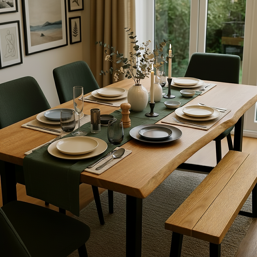 The Live Edge Ash Dining Table by TRL Handmade Furniture is a beautifully handcrafted piece made from kiln-dried solid ash wood, celebrated for its striking grain and natural warmth. Expertly finished with fine sanding and a protective Osmo oil coat, this wooden dining table brings elegance and durability to any dining space. Perfect for enclosed rooms with limited natural light, its light tone and smooth live edge design create a welcoming and sophisticated atmosphere.