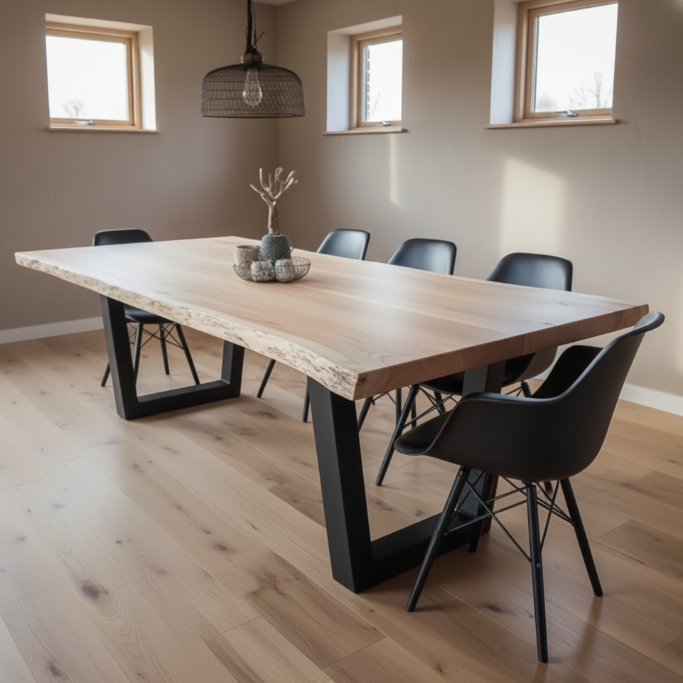 This handcrafted Live Edge Beech Dining Table is available with a selection of stylish leg options, including our popular Triangular legs, as well as X, Box U, and V shapes. All legs come in black as standard, but you can choose a different finish or provide a RAL Classic colour code at no extra cost. For those seeking the look and feel of quality hardwood wooden furniture without the high price tag, this wooden table offers an elegant and affordable solution.