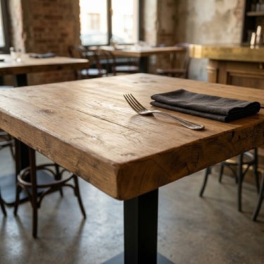 Handmade with a high-quality wooden top, it is finished with three coats of industrial-grade varnish for durability. It resists spills, heavy use, and frequent cleaning, making it perfect for hospitality furniture, bar tables, and restaurant interiors. A dependable choice for commercial and contract furniture, this tabletop combines strength with a timeless rustic finish. Backed by a 5-year guarantee for added confidence.
